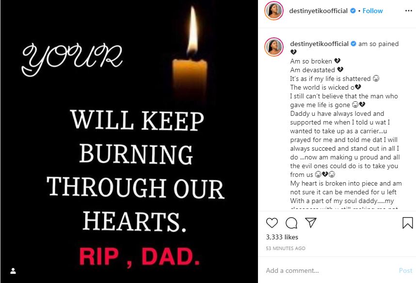 Nollywood actress, Destiny Etiko is heartbroken as she has lost her father.