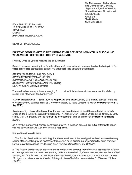 Meanwhile, Pop artist Folarin Falana aka “Falz”, whose song was used in the video has written to the Nigerian Immigration service demanding for the agency to reconsider the decision to repost the female officers.