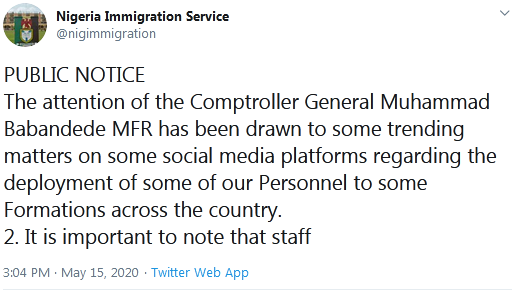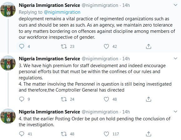 But on Friday, the Nigerian Immigration through its official twitter handle, announced the decision to suspend the punitive postings.