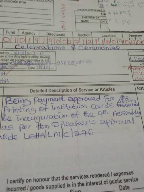 It reads, “Being payment approved for the printing of invitation cards during the inauguration of the 9th Assembly as per Hon. Speaker’s approval vide LSHA/LM/C/276.”
