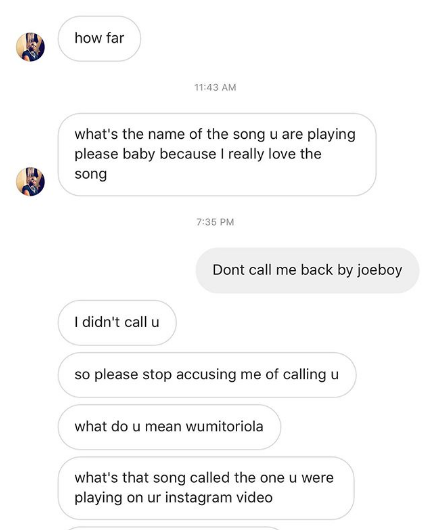 Wunmi Toriola replied with “Don’t call me back,” which coincidentally happens to be the title of the song. The follower however angrily replied Wunmi that he did not call her in the first place so she has no reason to tell him not to call her back.