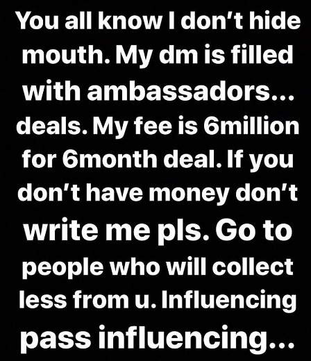 The bleaching guru and alleged gay man took to his Instagram account to state that he charges 6 million naira/ 6 months per ambassadorial dea.