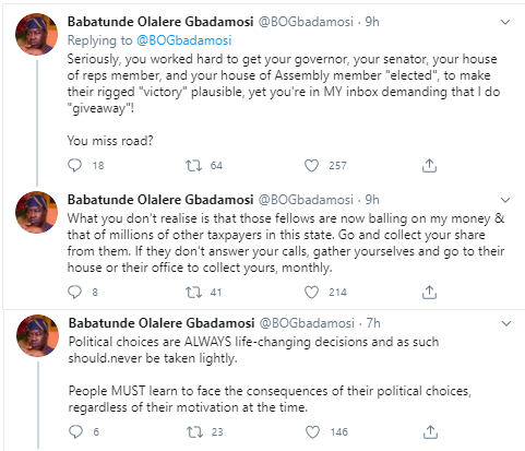 Gbadamosi took to his Twitter handle to issue the stern warning and told those asking him to do giveaways, to take their financial problems to the current leaders they voted for.