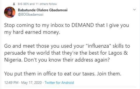 Gbadamosi took to his Twitter handle to issue the stern warning and told those asking him to do giveaways, to take their financial problems to the current leaders they voted for.