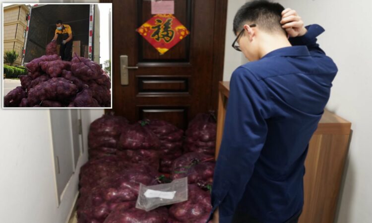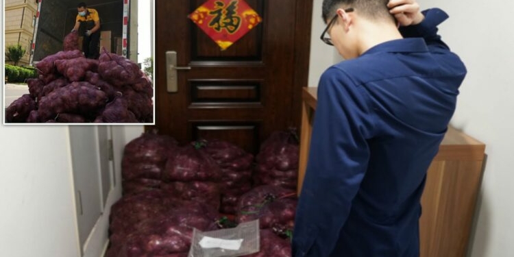 A picture released by Chinese media shows the alleged cheating boyfriend looking at the pile of vegetables after they were delivered to his door.