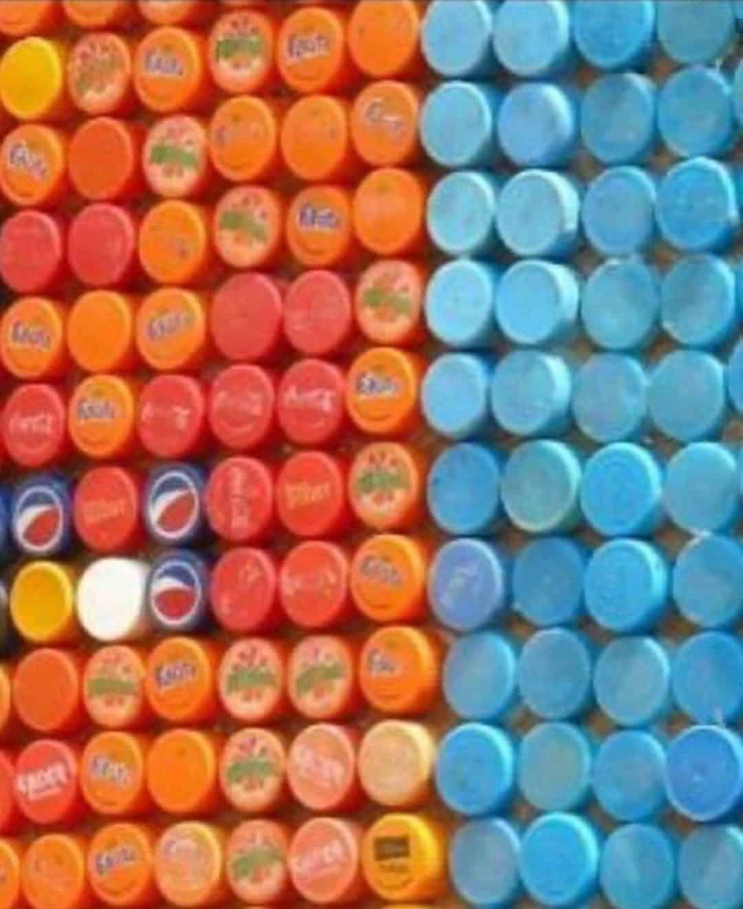 A first look at the photo will make an observer think they are looking at a painting on a smooth canvass, but the incredible painting was actually done with several use of the covers of soft drink bottles.