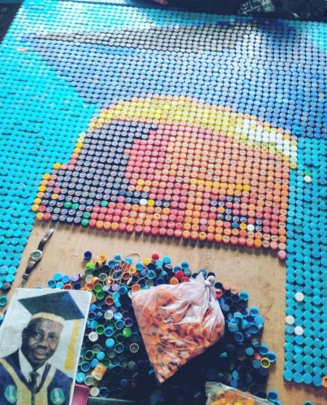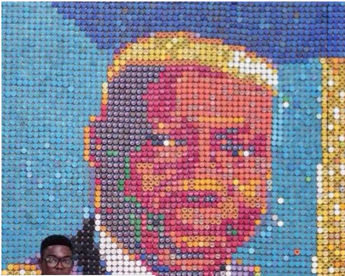 The young man who revealed the photo of the portrait said it’s the biggest bottle cap potrait in Africa.