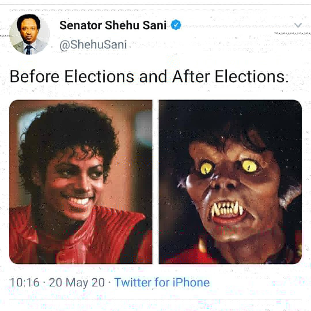 Senator Shehu Sani had earlier uploaded a photo mimicking politicians on how they relate with people pre and post-elections which probably did not meet Bashir El-Rufai well.