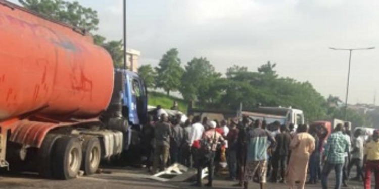 Eyewitnesses disclosed that the tanker collided with a fully loaded commercial bus on the bridge causing heavy traffic that stretches beyond the state Secretariat in Alausa.