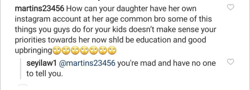 “How can your daughter have her own instagram account at her age common bro some of this things you guys do for your kids doesn’t make sense your priorities towards her now shld be education and good upbringing.”