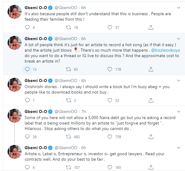 In tweets she shared, the media personality stated that people who can’t let go of N5k are asking record labels being owed millions to “just forgive and forget“.