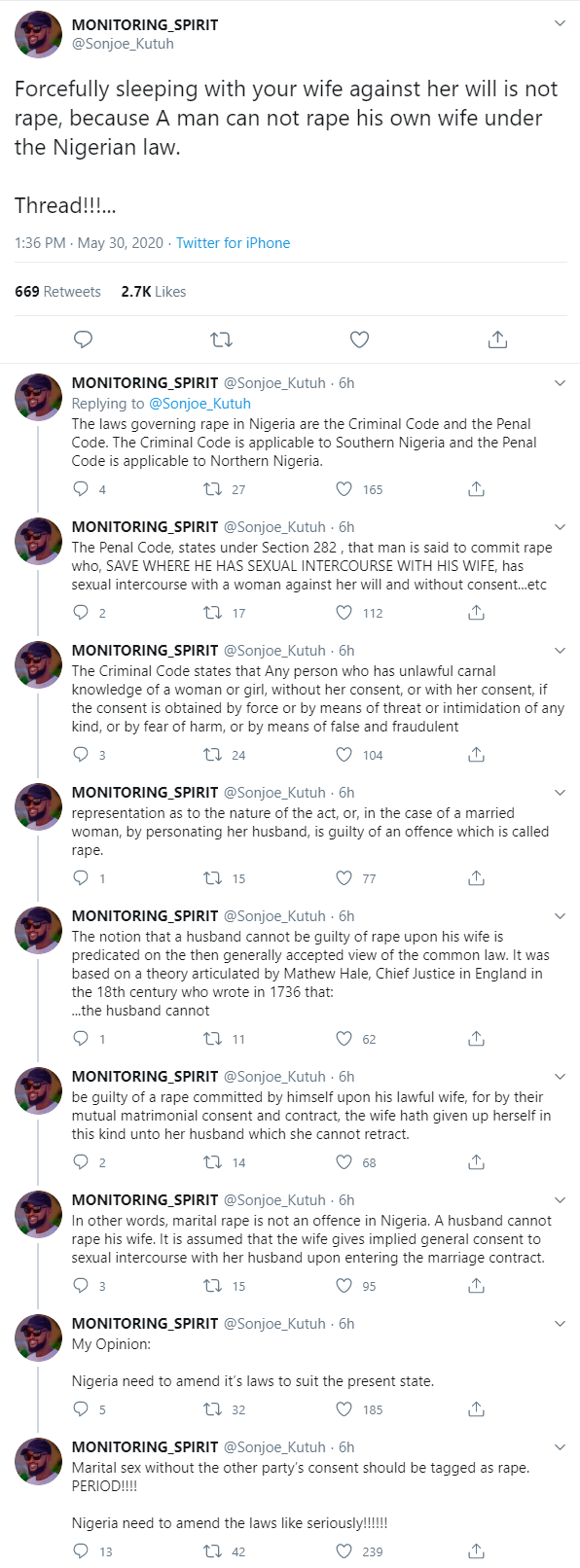 In @Sanjoe_Kutuh opinion, Nigerian’s law is outdated and the country needs to amend it’s laws to suit the present state and he feels that marital sex without the other party’s consent should be tagged as rape.