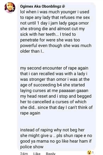 A Calabar man has taken to social media platform, Facebook to boast about how he used to rape any girl that refuses to slepp with him.