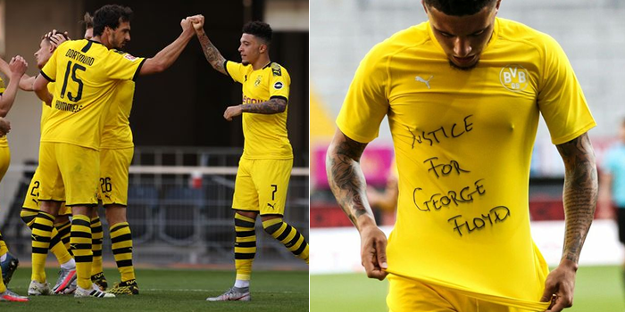 Borussia Dortmund’s Jadon Sancho scored a hat-trick today and revealed a “Justice for George Floyd” T-shirt amid several protests over the death of George Floyd.