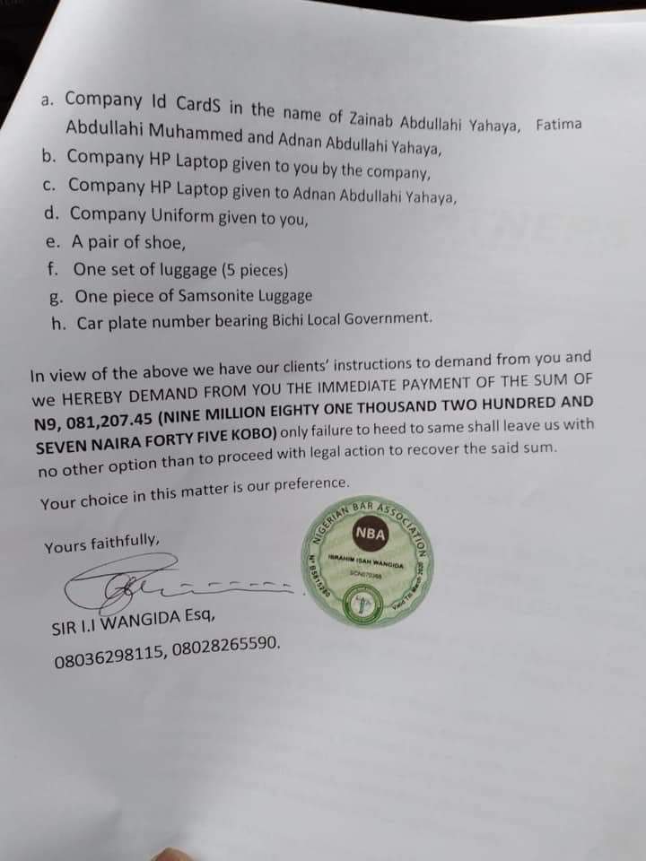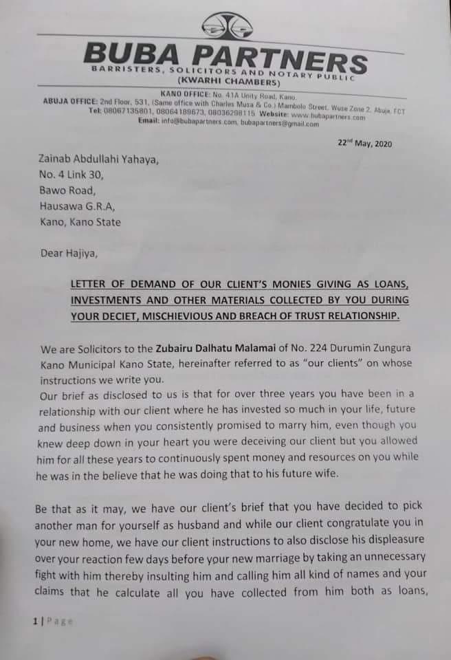 According to reports, a Nigerian man identified as Zubairu Dalhatu Malamal is currently demanding a sum of 9 million naira from his ex-girlfriend identified as Zainab Abdullahi Yahaya (who happen to be the new bride of Col Hameed Ali rtd) of 3-years who refused to marry him.