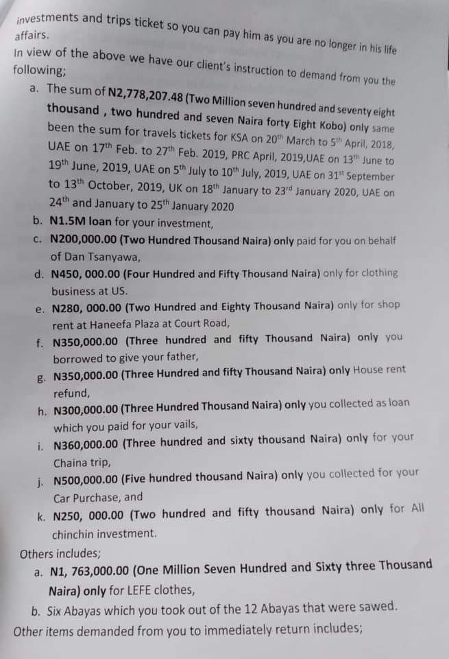 Ex-boyfriend of new wife of custom’s BOSS demands payment of 9milliom spent during their relationship through his lawyer.