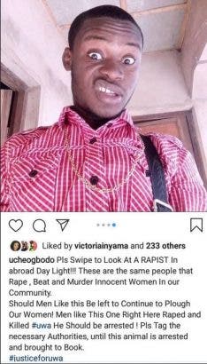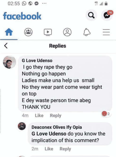 The young man identified as G Love Udenso on Facebook, dropped a comment under a post calling for the end of rape.