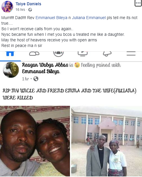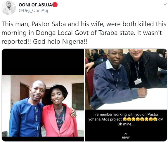 Yet-to-be identified gunmen have reportedly killed a clergyman identified as Reverend Emmanuel Saba Bileya and his wife identified as Julianna in Mararraba community in Donga local government area of Tabara state.