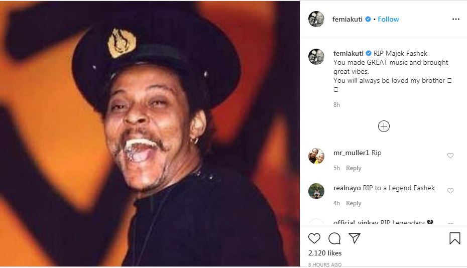Kuti wrote on Instagram, “RIP Majek Fashek. You made great music and brought great vibes. You will always be loved my brother,” he wrote on Instagram.