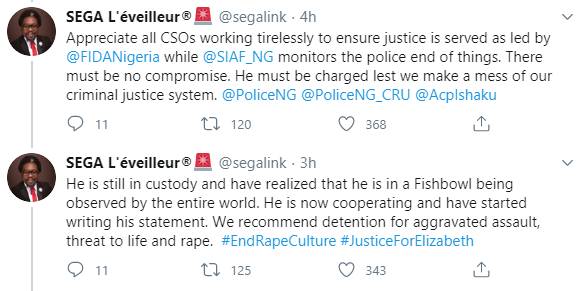 He wrote: “Elizabeth has gone through Hell. There’s been many threats to her life on the record & the @PoliceNG investigation has all the evidence.
