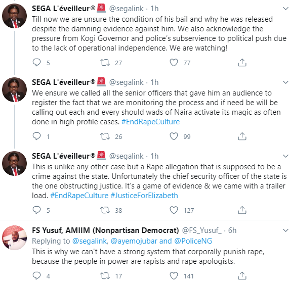 He added: “Till now we are unsure the condition of his bail and why he was released despite the damning evidence against him. We also acknowledge the pressure from Kogi Governor and police’s subservience to political push due to the lack of operational independence. We are watching!”