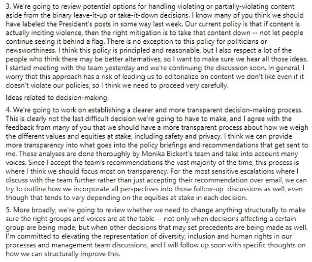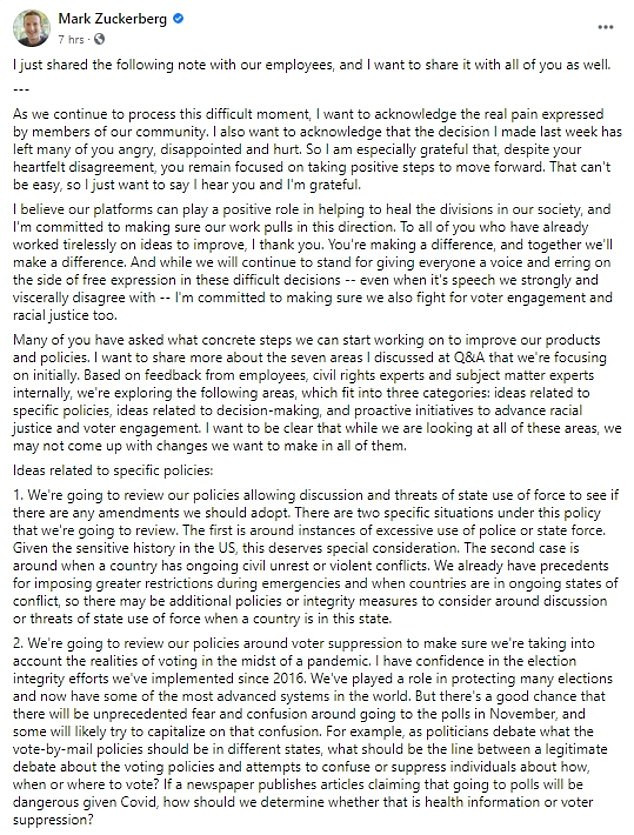 The announcement, which came in the form of a letter to employees, said: ‘We’re going to review our policies allowing discussion and threats of state use of force to see if there are any amendments we should adopt,’ Zuckerberg wrote.