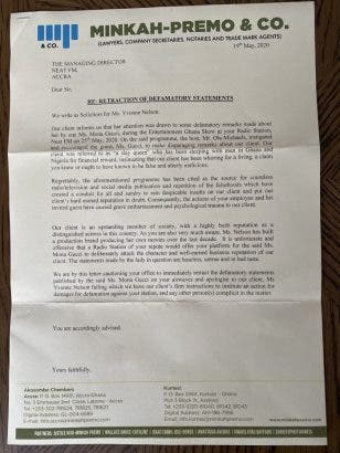 “My lawyers wrote to NEAT FM and MONA GUCCI concerning some defaming statements made about me on their platform, we asked they quickly retract their statements/ issue an apology. NEAT FM just did, Lawyers will pursue MONA GUCCI’s .