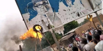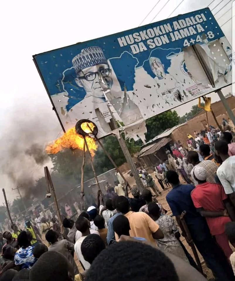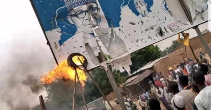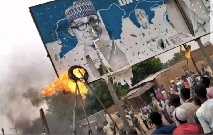 WITHIN NIGERIA learnt that the angry residents reportedly set fire on a billboard of President Muhammadu Buhari and the state governor, Aminu Masari with the inscription ”The faces of fairness and champions of the masses.”