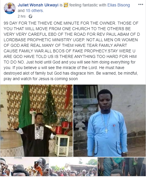 99 DAY FOR THE THIEVE ONE MINUTE FOR THE OWNER. THOSE OF YOU THAT WILL MOVE FROM ONE CHURCH TO THE OTHERS BE VERY VERY CAREFUL EBD OF THE ROAD FOR REV PAUL ABAM OF D LORDBASE PROPHETIC MINISTRY UGEP. NOT ALL MEN OR WOMEN OF GOD ARE REAL.MANY OF THEM HAVE TEAR FAMILY APART CAUSE FAMILY WAR ALL BCOS OF FAKE PROPHECY.STAY WERE U ARE GOD HAVE TOLD US IS THERE ANYTHING TOO HARD FOR HIM TO DO NO. Just hold until God and you will see him doing everything for you. If you believe u will see the miracle of the Lord. He must have destroyed alot of family but God has disgrace him. Be warned, be mindful, pray and watch for Jesus is coming soon.