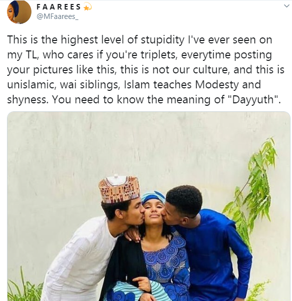One Muslim lady reshared the photo and wrote: “This is the highest level of stupidity I’ve ever seen on my TL, who cares if you’re triplets, everytime posting your pictures like this, this is not our culture, and this is unislamic, wai siblings, Islam teaches Modesty and shyness. You need to know the meaning of “Dayyuth”.”
