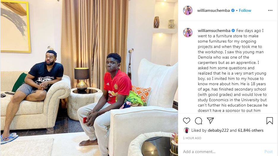 Nollywood actor, Williams Uchemba, has announced that he has adopted a young man named Demola, whom he met working as an apprentice in a furniture store and promised to sponsor his university education.