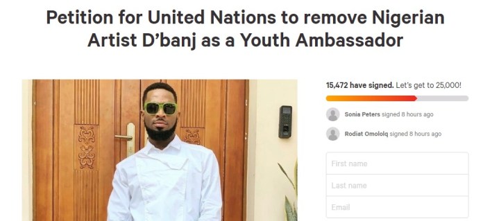 Over 15,000 persons have now signed a petition to strip Nigerian singer, D’Banj, of his UN appointment and endorsements with popular brands amid the rape allegations he’s facing.