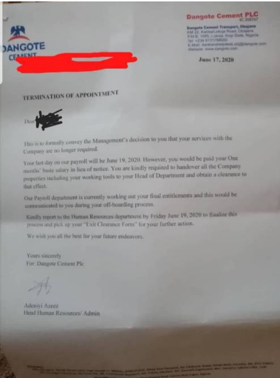 In a now viral “Termination of appointment” letter reportedly from the HR of the company to terminated staff, the affected staff were instructed to stop work as at today, 19th June, 2020 without any strong reason.