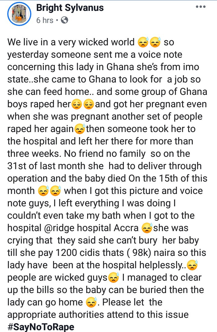 The pitiful plight of a Nigerian woman who recently lost the child she gave birth to after being gang-raped in Ghana has been shared by a Facebook user known as Bright Sylvanus.