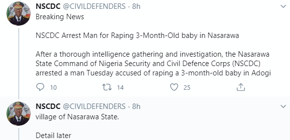 “After a thorough intelligence gathering and investigation, the Nasarawa State Command of Nigeria Security and Civil Defence Corps arrested a man Tuesday accused of raping a three-month-old baby in Adogi Village of Nasarawa State” the security outfit tweeted