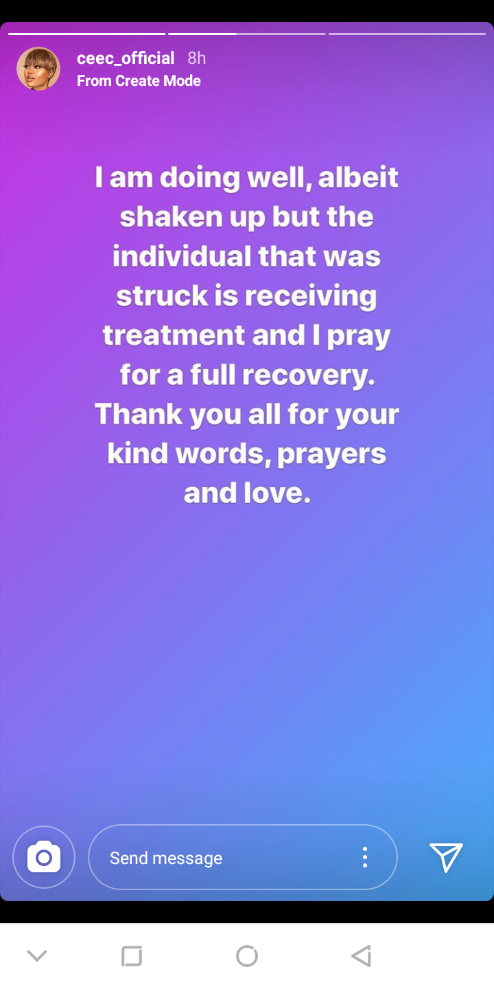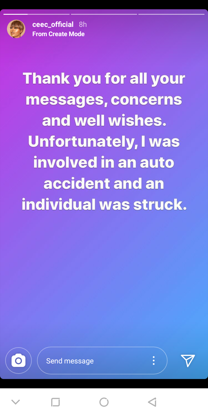 Former BBNaija housemate, Cee-c has given update about earlier reports that she was involved in an auto accident.