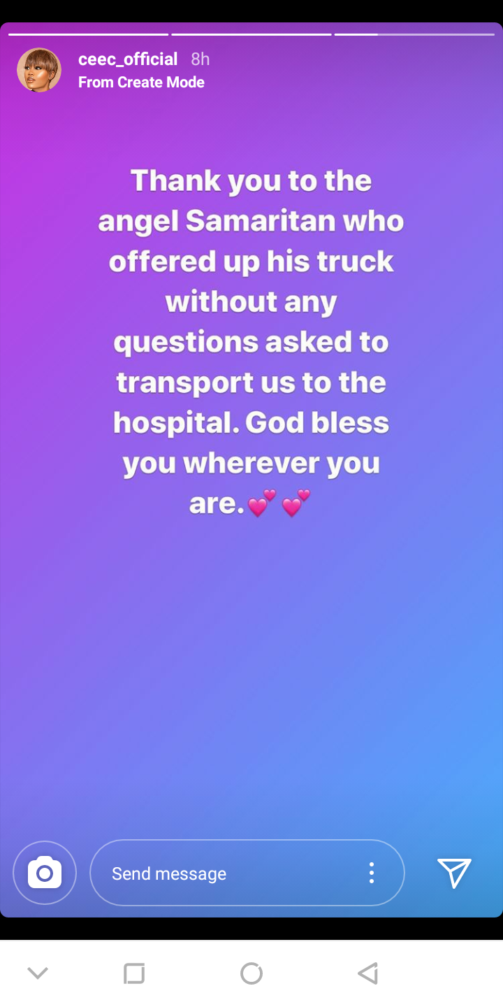 Recall that yesterday Cee-C, was involved in a road accident today at Enugu after the brakes of the ford truck she was driving failed.