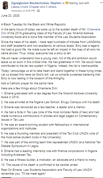 In the early hours of today, we woke up to the sudden death of Mr. Chiemerie Dim of the 2019 graduating class of the Faculty of Law, Nnamdi Azikiwe University Awka and a bona fide member of the Law Students Association.