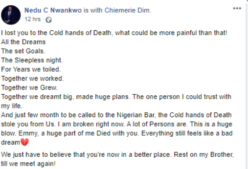 Another friend of the deceased, Ogoegbulem Stephen, wrote