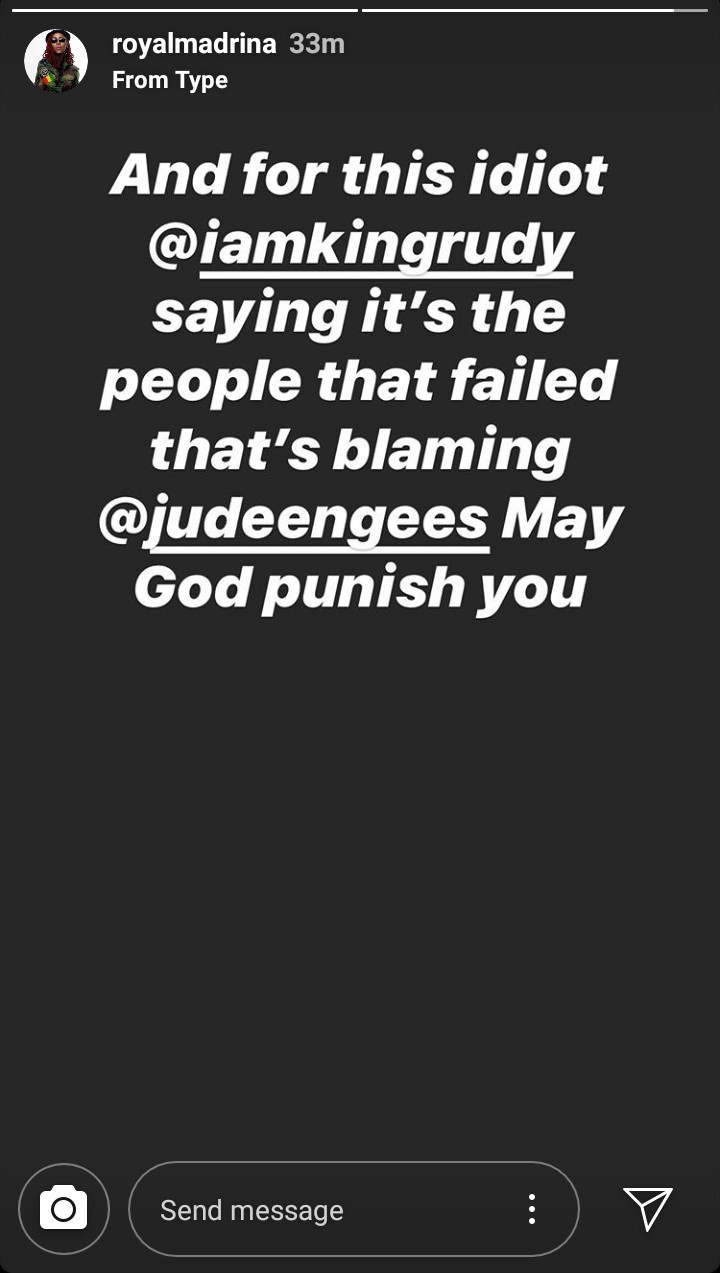 She wrote: “And for this idiot @iamkingrudy saying it’s people that failed that’s blaming @judeengees May God punish you.”