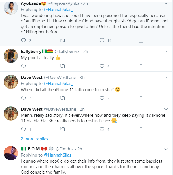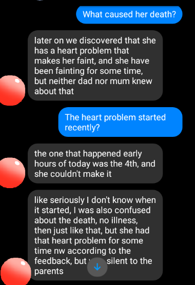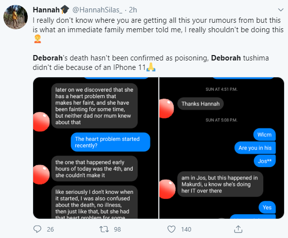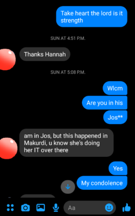 However, as seen in chat shared by a family friend, the lady simply fainted and died. She wasn’t poisoned as claimed and the incident happened in Makurdi where she was doing her IT, not Jos.