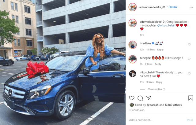 Meanwhile, the elated Adenike also shared the photos of her new car on her Instagram page and wrote; “Graduation gift THANK YOU DADDY !!! @ademolaadeleke_01 love you 🥰”