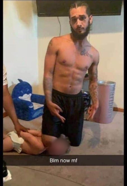 The provocative photo shows the shirtless Black man kneeling on the neck of a White toddler while another person held his arms behind his back, in the same position that led to the death of George Floyd in Minneapolis back in May.