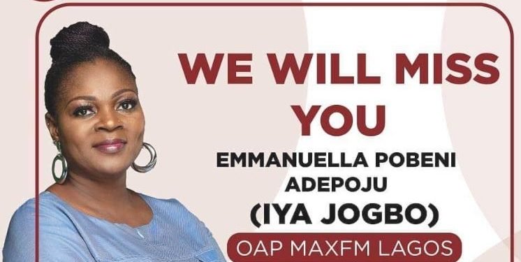 Popular Max FM Lagos radio presenter, Emmanuella Pobeni Adepoju, popularly known as Iya Jogbo, is dead.