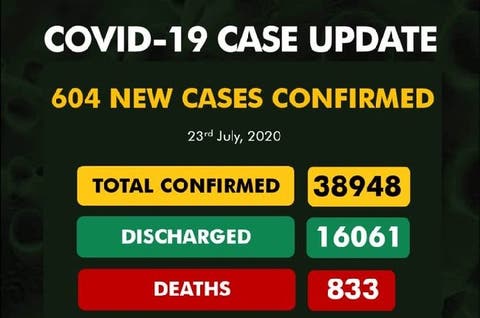 The Nigeria Centre for Disease Control (NCDC) has confirmed 604 new cases of COVID-19 in the country, bringing the total number to 38,948.