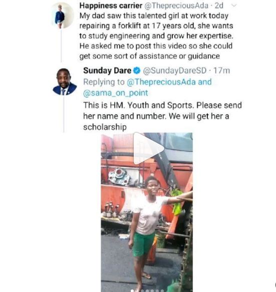 Luck shined on a 17-year-old SS2 student and mechanic apprentice after a video of her fixing a forklift made the rounds on social media gaining so much engagements, even catching the attention of the honorable Minister of Youths and Sports, Sunday Dare, who has promised her scholarship.