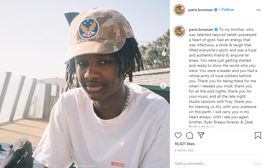 “To my brother, who was talented beyond belief, possessed a heart of gold, had an energy that was infectious, a smile & laugh that lifted everyone’s spirit, and was a loyal and authentic friend to anyone he knew. You were just getting started and ready to show the world who you were. You were a leader and you had a whole army of loyal soldiers behind you,” the post began. “Thank you for being there for me when I needed you most, thank you for all the wild nights, thank you for your music and all the late night studio sessions with Fray, thank you for blessing us ALL with your presence on this earth. I will carry you in my heart always. Until I see you again brother. Ryan Breaux forever & Zeek Bishop forever.”