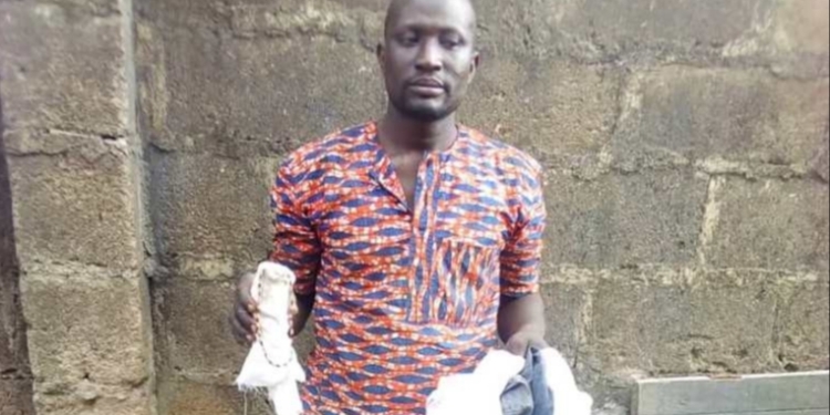 Items such as a wooden coffin containing white cloth and other substances like a horn wrapped with white cloth and beads were recovered from the suspect.
