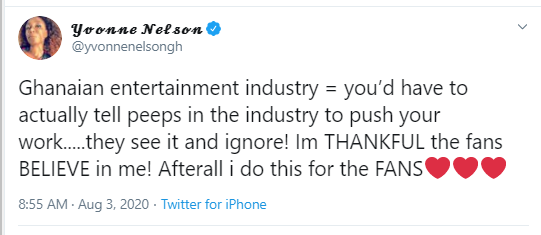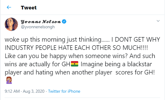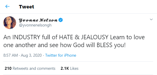 In one tweet, Yvonne said the Ghanaian entertainment industry is ‘full of hate and jealousy.’