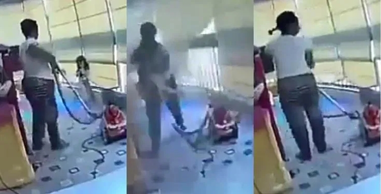 The video shows the nanny moving swiftly to carry the child away after the explosion shattered some parts of their home.